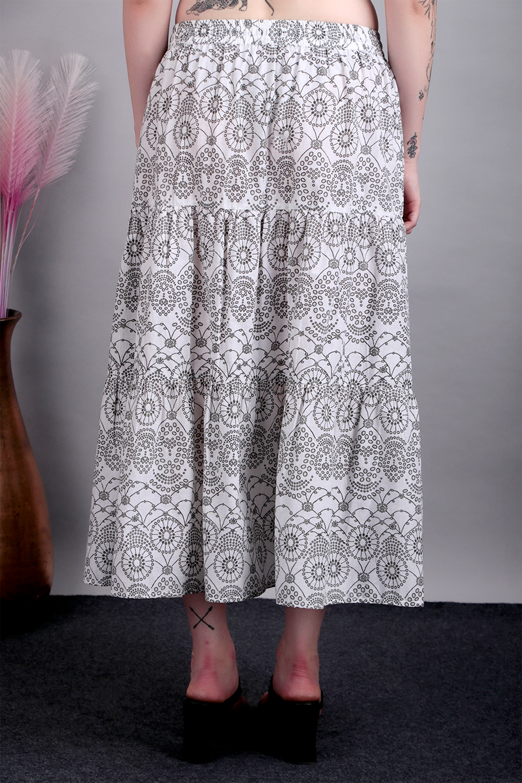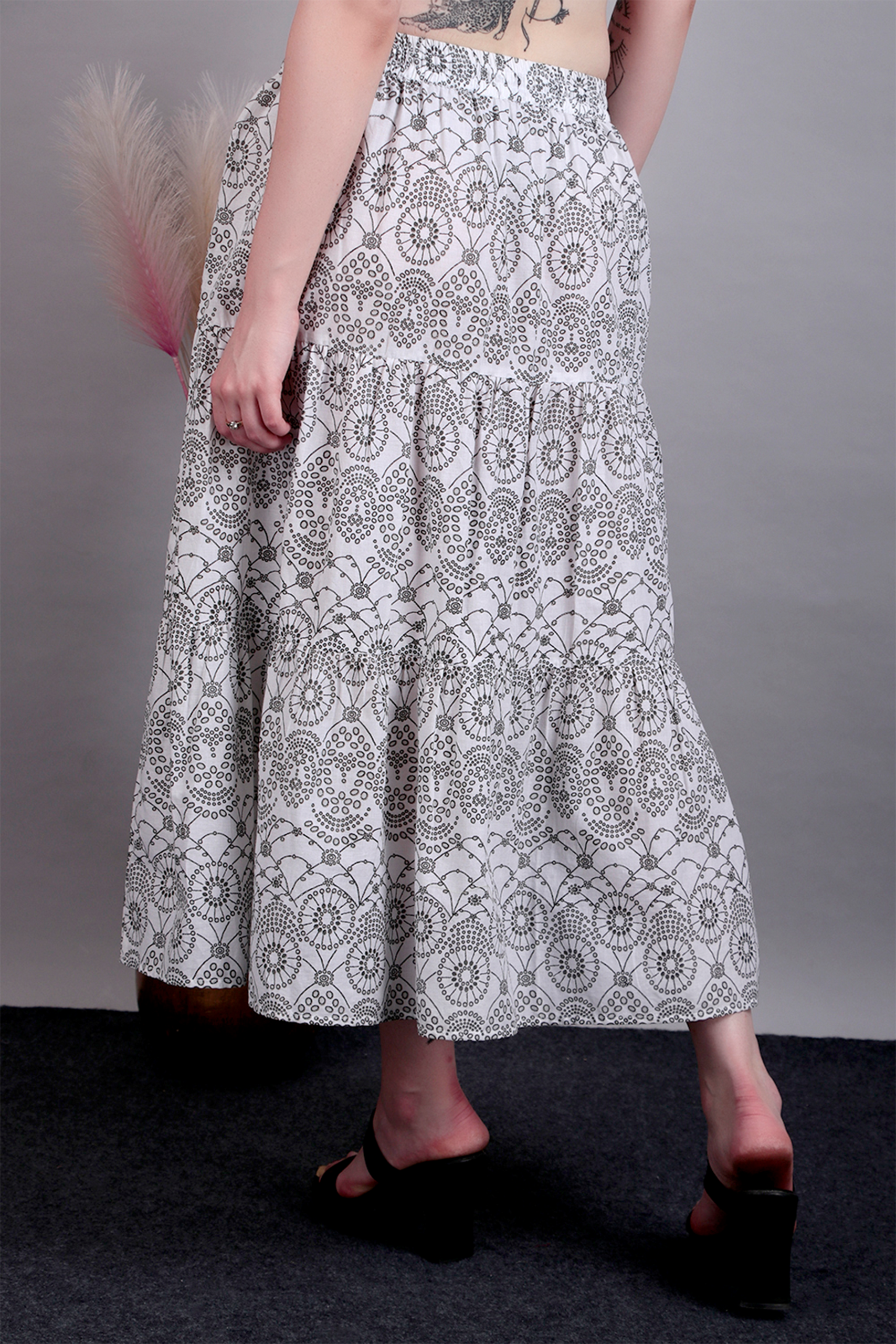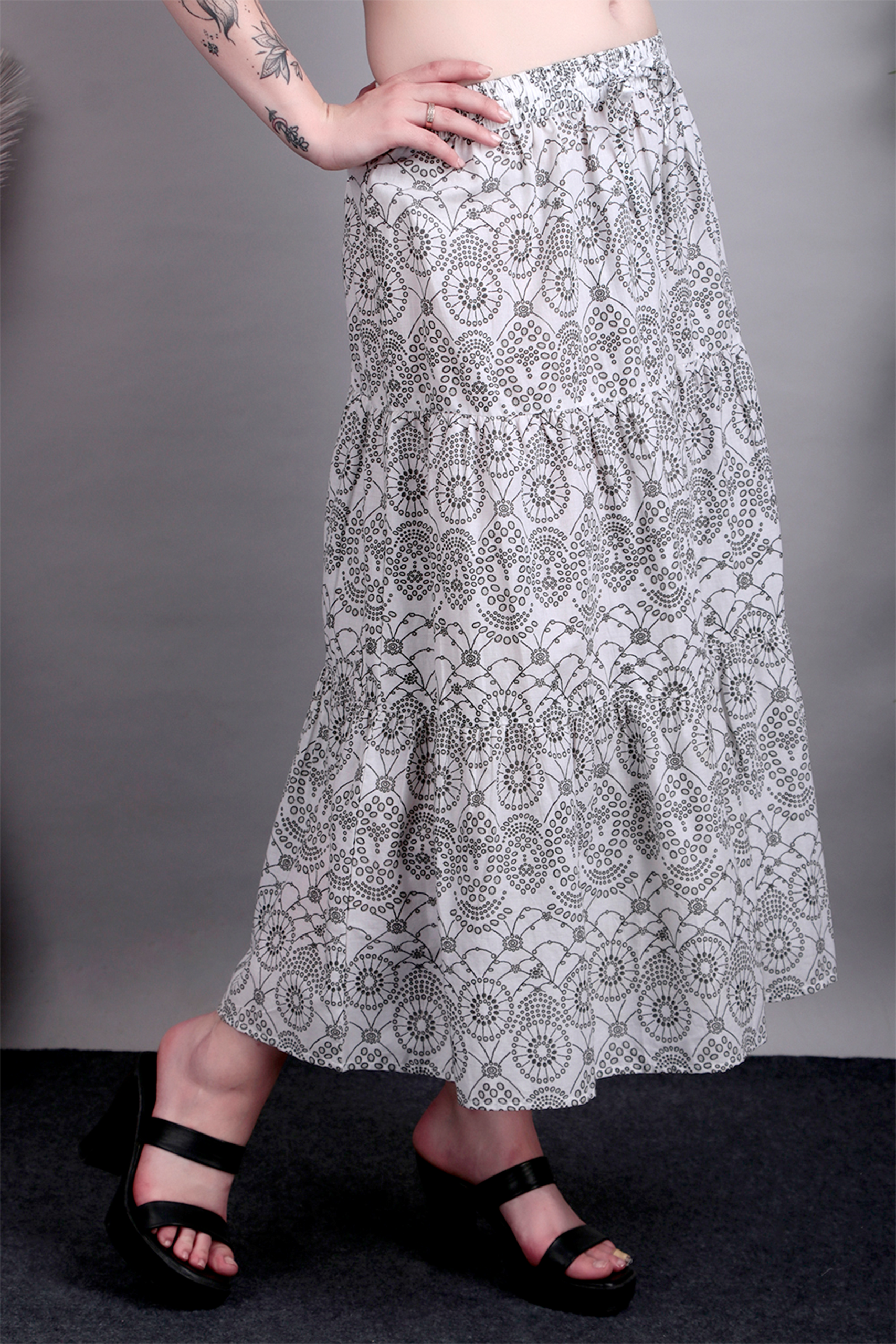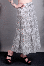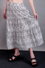 Add timeless charm to your wardrobe with this black and white printed cotton skirt. Lightweight and breathable, it’s perfect for warm days and versatile styling.